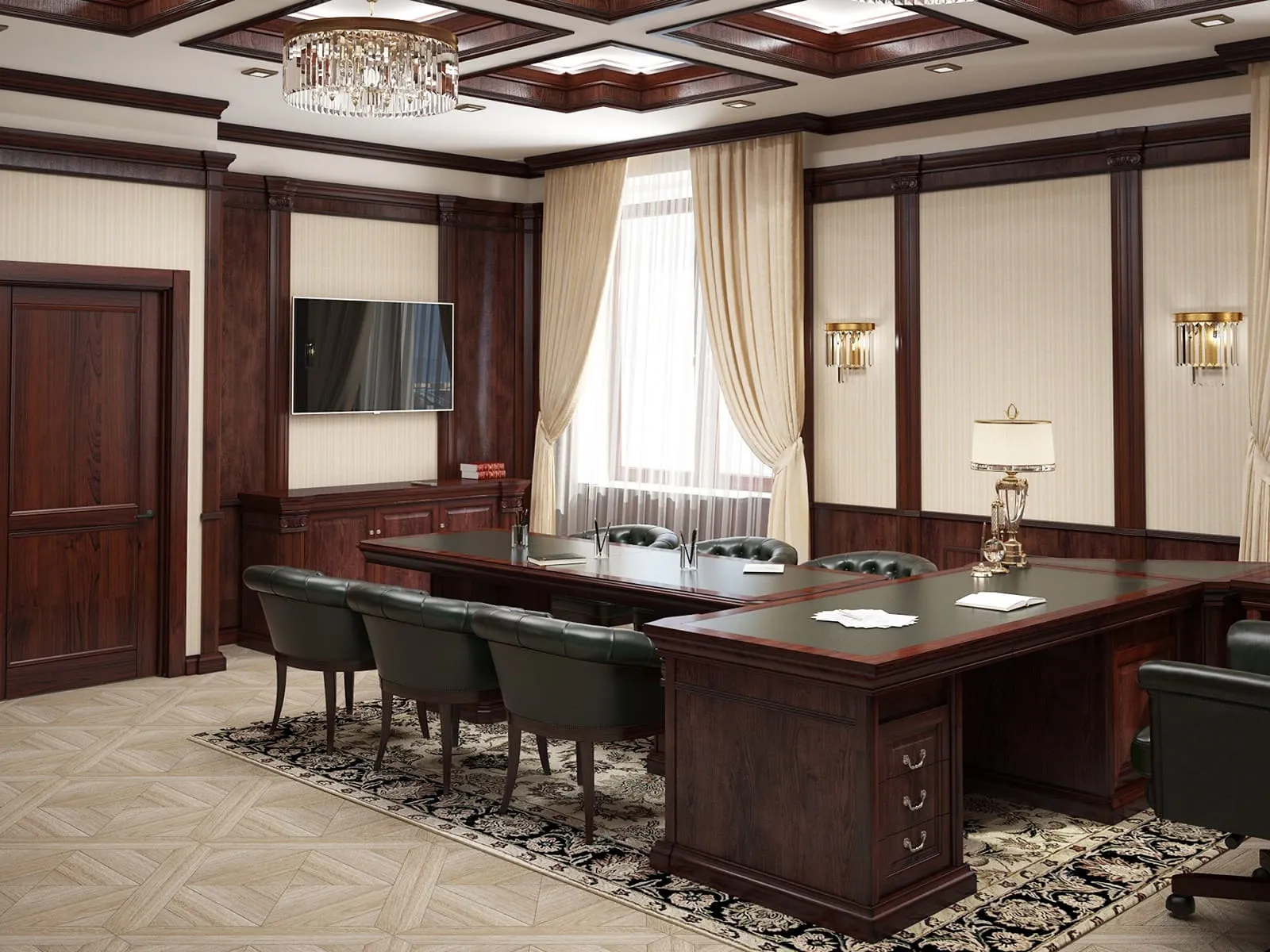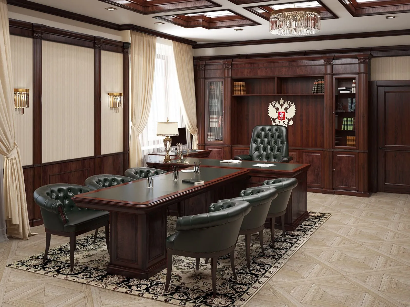 Установив в кабинете руководителя данный гарнитур, вы превратите офисное помещение в роскошные апартаменты, напоминающие царские покои прошлых веков. Этот мебельный комплект станет выгодным приобретением для престижных организаций с именем и статусом.