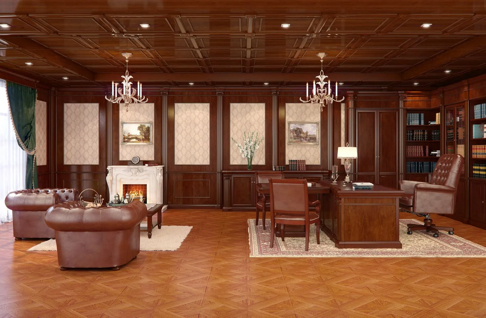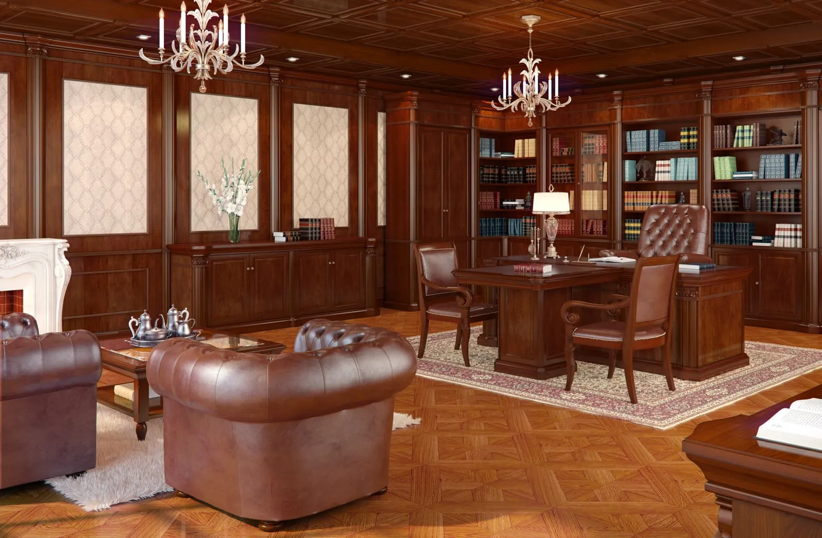 Набор мебели может быть представлен в различных комплектациях: обычно в него входят шкафы, кресла и письменный стол. Гарнитур изготовлен из лучших сортов дерева и покрыт дорогостоящим лакокрасочным составом. Натуральные оттенки мебели создают атмосферу спокойствия и благородства.
