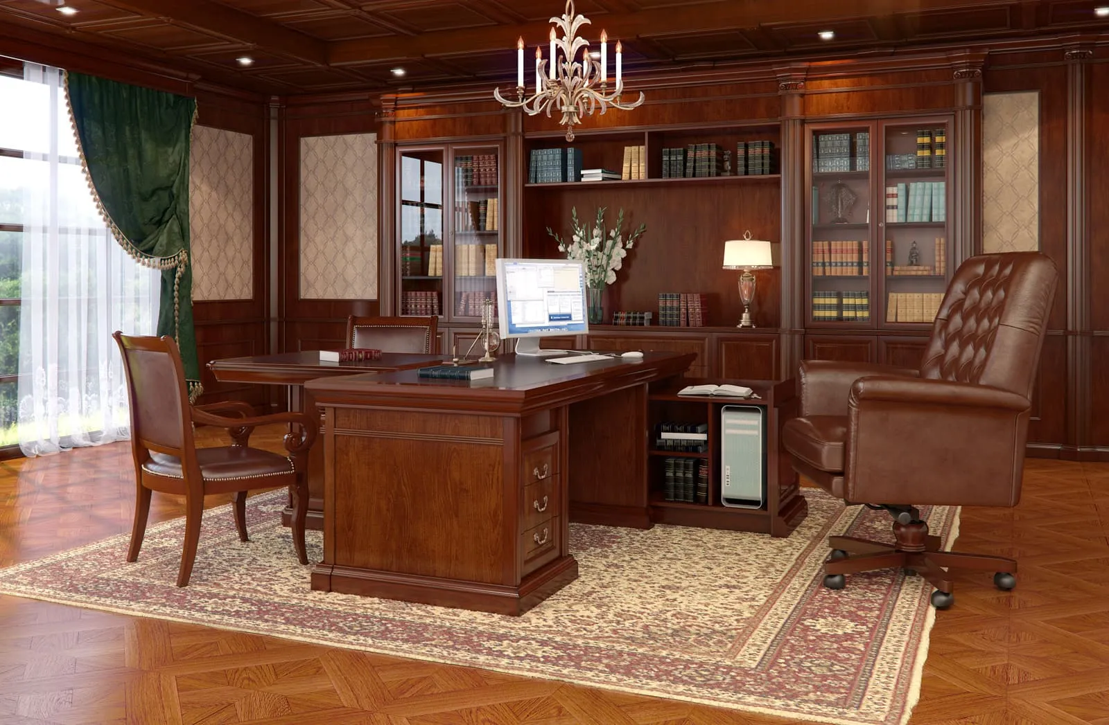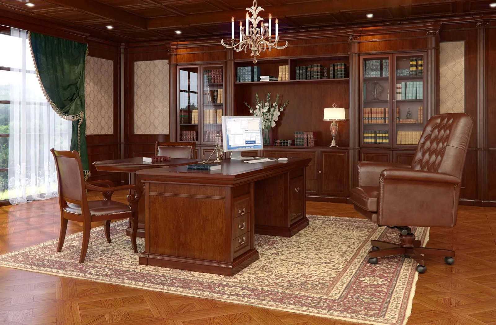 Кабинет Монарх - это комплект офисной мебели, выполненный в традиционном английском стиле. Данный мебельный гарнитур сочетает в себе все достоинства, свойственные классической мебели: солидный внешний вид, высокое качество материалов и фурнитуры, удобство в эксплуатации и многофункциональность. Вы можете приобрести данный комплект мебели в интернет-магазине Directoria или одном из салонов нашей фирмы.