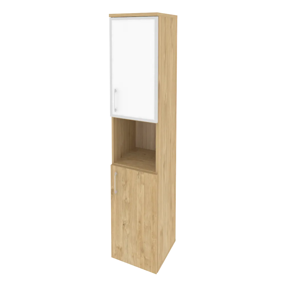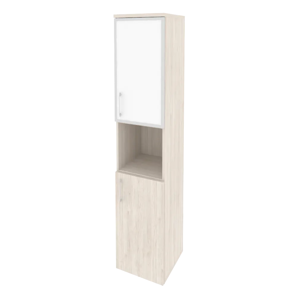 Шкаф высокий узкий правый (1 низкий фасад ЛДСП + 1 низкий фасад стекло лакобель в раме)